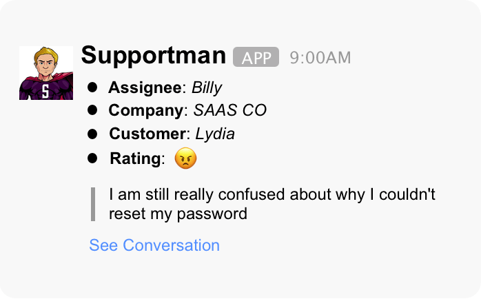 Supportman is an integration built specifically for Intercom and Slack for support teams. It sends conversation ratings to a channel in Slack once a customer leaves one.