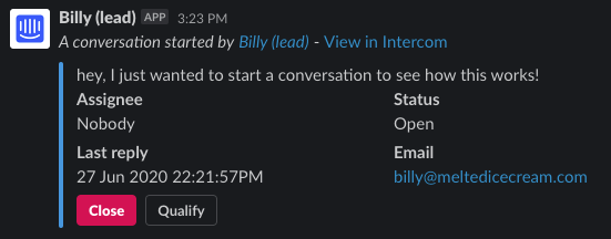 This is the integration that is created by Intercom. It allows you to talk to your leads from Slack.